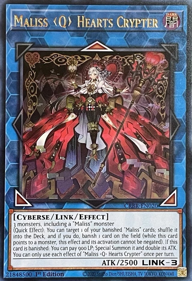 (Quick Effect): You can target 1 of your banished "Maliss" cards; shuffle it into the Deck, and if you do, banish 1 card on the field (while this card points to a monster, this effect and its activation cannot be negated). If this card is banished: You can pay 900 LP; Special Summon it and double its ATK. You can only use each effect of "Maliss Hearts Crypter" once per turn.
