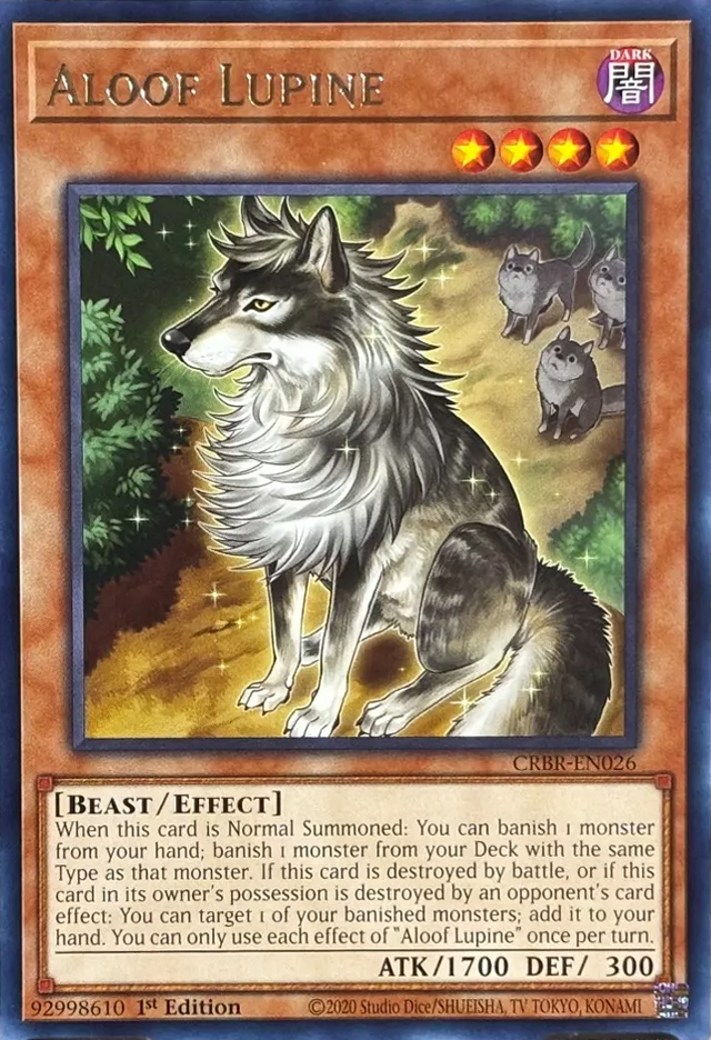 When this card is Normal Summoned: You can banish 1 monster from your hand; banish 1 monster from your Deck with the same Type as that monster. If this card is destroyed by battle, or if this card in its owner's possession is destroyed by an opponent's card effect: You can target 1 of your banished monsters; add it to your hand. You can only use each effect of "Aloof Lupine" once per turn.