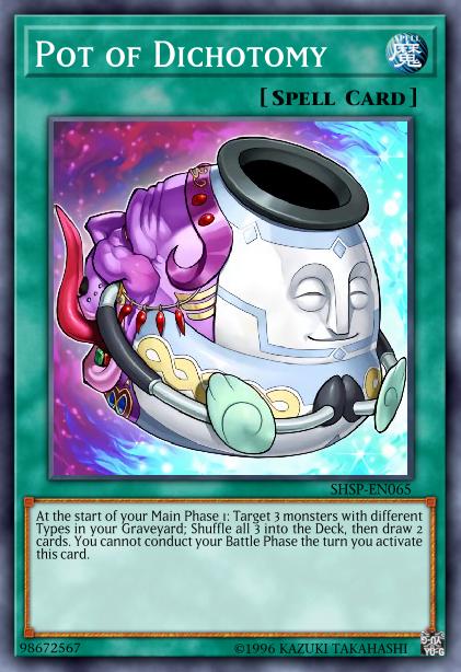 At the start of your Main Phase 1: Target 3 monsters with different Types in your Graveyard; Shuffle all 3 into the Deck, then draw 2 cards. You cannot conduct your Battle Phase the turn you activate this card.