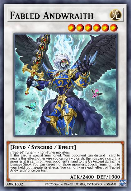 If this card is Special Summoned: Your opponent can discard 1 card to negate this effect, otherwise you can draw 2 cards, then discard 1 card. If a monster(s) is sent from your opponent's hand to the GY (except during the Damage Step): You can target 1 of those monsters; Special Summon it to your field, but negate its effects. You can only use each effect of "Fabled Andwraith" once per turn.