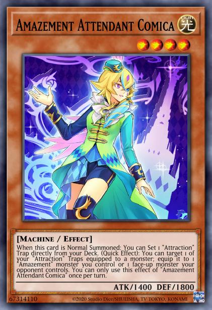 When this card is Normal Summoned: You can Set 1 "Attraction" Trap directly from your Deck. (Quick Effect): You can target 1 of your "Attraction" Traps equipped to a monster; equip it to 1 "Amazement" monster you control or 1 face-up monster your opponent controls. You can only use this effect of "Amazement Attendant Comica" once per turn.