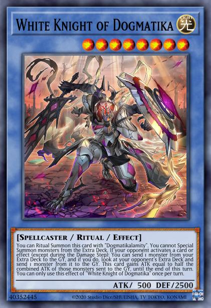 You can Ritual Summon this card with "Dogmatikalamity". You cannot Special Summon monsters from the Extra Deck. If your opponent activates a card or effect (except during the Damage Step): You can send 1 monster from your Extra Deck to the GY, and if you do, look at your opponent's Extra Deck and send 1 monster from it to the GY. This card gains ATK equal to half the combined ATK of those monsters sent to the GY, until the end of this turn. You can only use this effect of "White Knight of Dogmatika" once per turn.