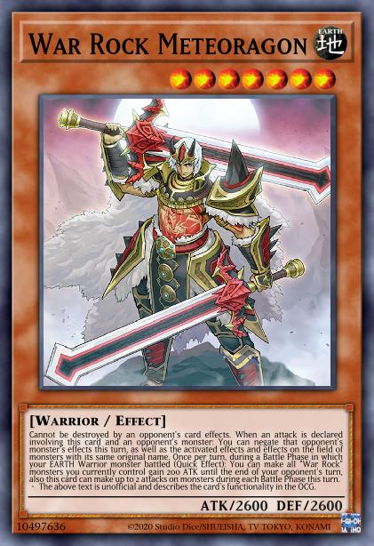 Cannot be destroyed by an opponent's card effects. When an attack is declared involving this card and an opponent's monster: You can negate that opponent's monster's effects this turn, as well as the activated effects and effects on the field of monsters with its same original name. Once per turn, during a Battle Phase in which your EARTH Warrior monster battles (Quick Effect): You can make all "War Rock" monsters you currently control gain 200 ATK until the end of your opponent's turn, also this card can make up to 2 attacks on monsters during each Battle Phase this turn.