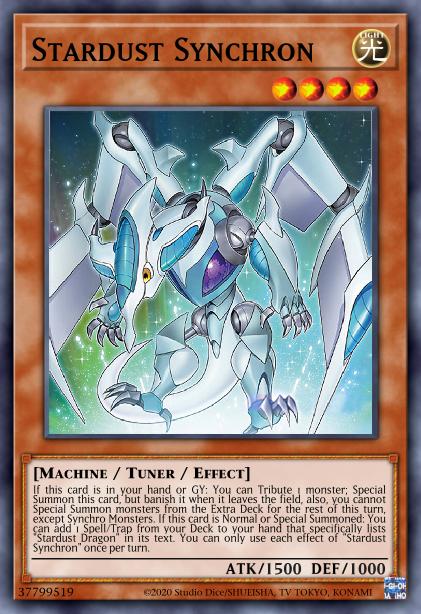 If this card is in your hand or GY: You can Tribute 1 monster; Special Summon this card, but banish it when it leaves the field, also, you cannot Special Summon monsters from the Extra Deck for the rest of this turn, except Synchro Monsters. If this card is Normal or Special Summoned: You can add 1 Spell/Trap from your Deck to your hand that specifically lists "Stardust Dragon" in its text. You can only use each effect of "Stardust Synchron" once per turn.
