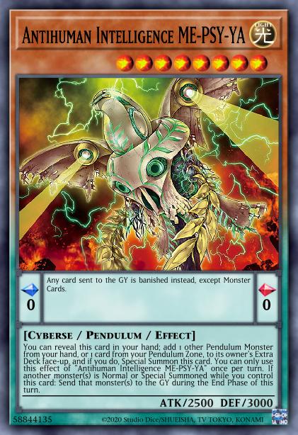 [ Monster Effect ] You can reveal this card in your hand; add 1 other Pendulum Monster from your hand, or 1 card from your Pendulum Zone, to its owner's Extra Deck face-up, and if you do, Special Summon this card. You can only use this effect of "Antihuman Intelligence ME-PSY-YA" once per turn. If another monster(s) is Normal or Special Summoned while you control this card: Send that monster(s) to the GY during the End Phase of this turn.