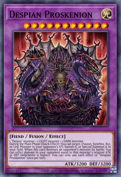 During the Main Phase (Quick Effect): You can target 1 Fusion, Synchro, Xyz, or Link Monster in your opponent's GY; banish it, or Special Summon it to your field. When this card destroys an opponent's monster by battle: You can inflict damage to your opponent equal to that monster's original ATK or DEF (whichever is higher). You can only use each effect of "Despian Proskenion" once per turn.