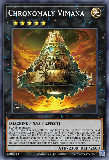 Once per turn (Quick Effect): You can target 1 face-up monster on the field and 1 Xyz Monster or "Chronomaly" monster in your GY; that monster on the field gains half the ATK of that monster in the GY (until the end of this turn), then attach that monster from the GY to this card as material. Once per turn, when your opponent activates a monster effect (Quick Effect): You can detach 2 materials from this card; negate the activation.