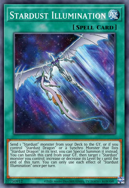 Send 1 "Stardust" monster from your Deck to the GY, or if you control "Stardust Dragon" or a Synchro Monster that lists "Stardust Dragon" in its text, you can Special Summon it instead. You can banish this card from your GY, then target 1 "Stardust" monster you control; increase or decrease its Level by 1 until the end of this turn. You can only use each effect of "Stardust Illumination" once per turn.