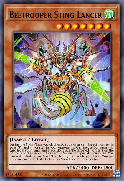 During the Main Phase (Quick Effect): You can target 1 Insect monster in your GY and 1 monster in your opponent's GY; Special Summon this card from your hand, and if you do, place the targeted monsters on the bottoms of the Decks. If this card is Normal or Special Summoned: You can add 1 "Beetrooper" Spell/Trap from your Deck to your hand. You can only use each effect of "Beetrooper Sting Lancer" once per turn.