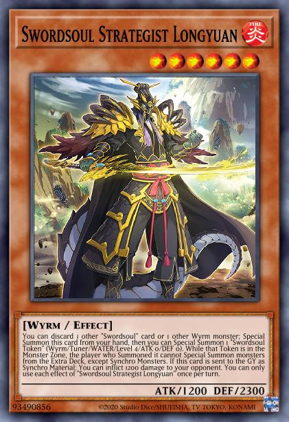 You can discard 1 other "Swordsoul" card or 1 other Wyrm monster; Special Summon this card from your hand, then you can Special Summon 1 "Swordsoul Token" (Wyrm/Tuner/WATER/Level 4/ATK 0/DEF 0). While that Token is in the Monster Zone, the player who Summoned it cannot Special Summon monsters from the Extra Deck, except Synchro Monsters. If this card is sent to the GY as Synchro Material: You can inflict 1200 damage to your opponent. You can only use each effect of "Swordsoul Strategist Longyuan" once per turn.