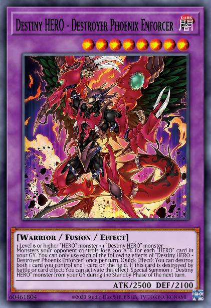 Monsters your opponent controls lose 200 ATK for each "HERO" card in your GY. You can only use each of the following effects of "Destiny HERO - Destroyer Phoenix Enforcer" once per turn. (Quick Effect): You can destroy both 1 card you control and 1 card on the field. If this card is destroyed by battle or card effect: You can activate this effect; Special Summon 1 "Destiny HERO" monster from your GY during the Standby Phase of the next turn.