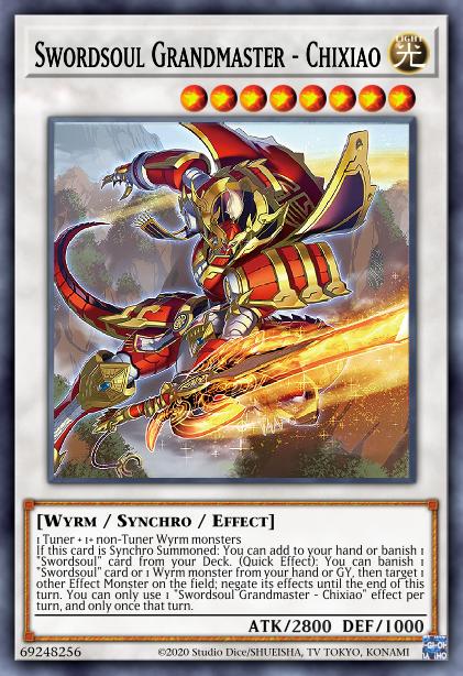 If this card is Synchro Summoned: You can add to your hand or banish 1 "Swordsoul" card from your Deck. (Quick Effect): You can banish 1 "Swordsoul" card or 1 Wyrm monster from your hand or GY, then target 1 other Effect Monster on the field; negate its effects until the end of this turn. You can only use 1 "Swordsoul Grandmaster - Chixiao" effect per turn, and only once that turn.