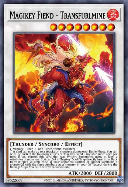 This card can make up to 2 attacks on monsters during each Battle Phase. You can only use each of the following effects of "Magikey Fiend - Transfurlmine" once per turn. If you control this card that was Synchro Summoned using at least 2 Attributes of monsters: You can Set 1 "Magikey" Spell/Trap directly from your Deck to your Spell & Trap Zone. If your opponent Normal or Special Summons a monster(s) with the same Attribute as a monster in your GY (except during the Damage Step): You can destroy that monster(s).