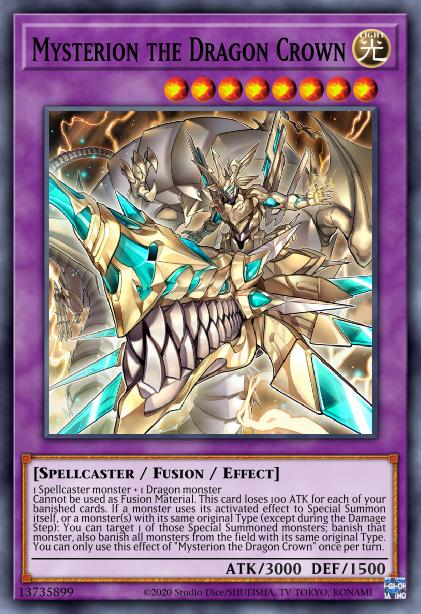 Cannot be used as Fusion Material. This card loses 100 ATK for each of your banished cards. If a monster uses its activated effect to Special Summon itself, or a monster(s) with its same original Type (except during the Damage Step): You can target 1 of those Special Summoned monsters; banish that monster, also banish all monsters from the field with its same original Type. You can only use this effect of "Mysterion the Dragon Crown" once per turn.